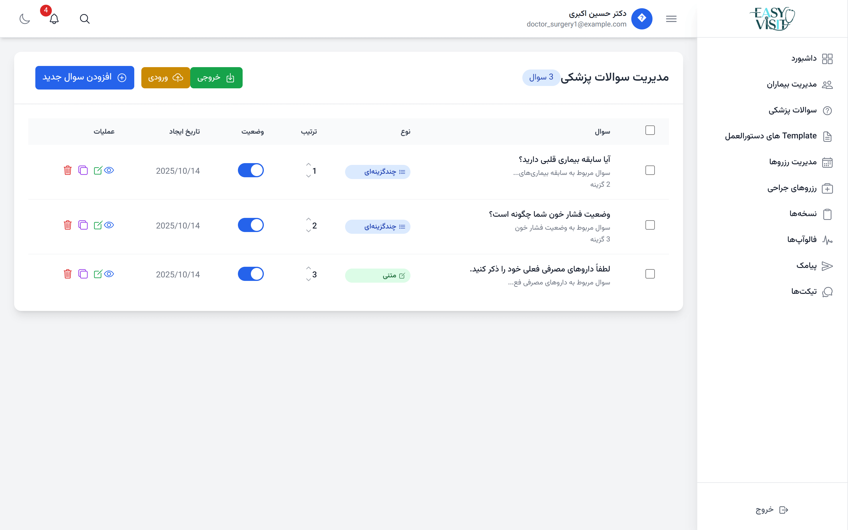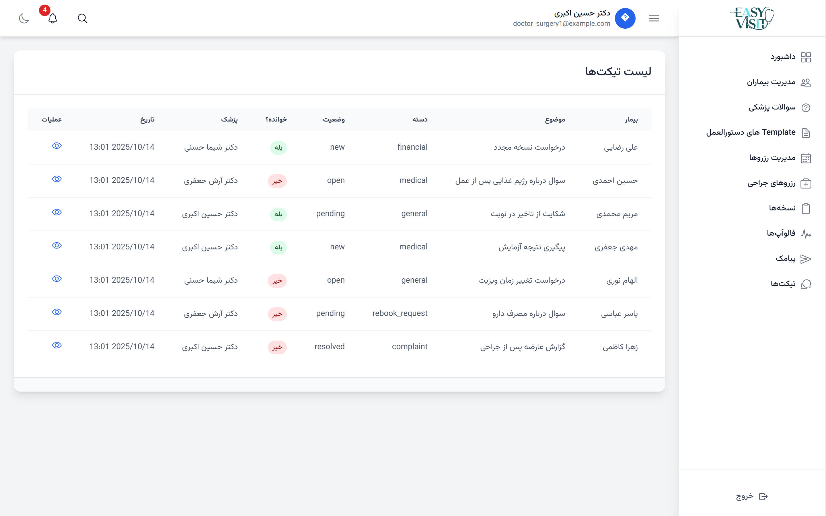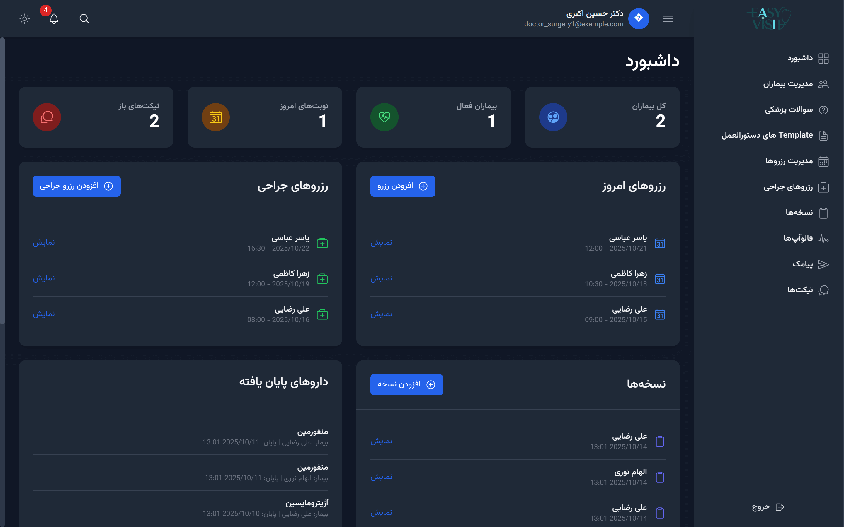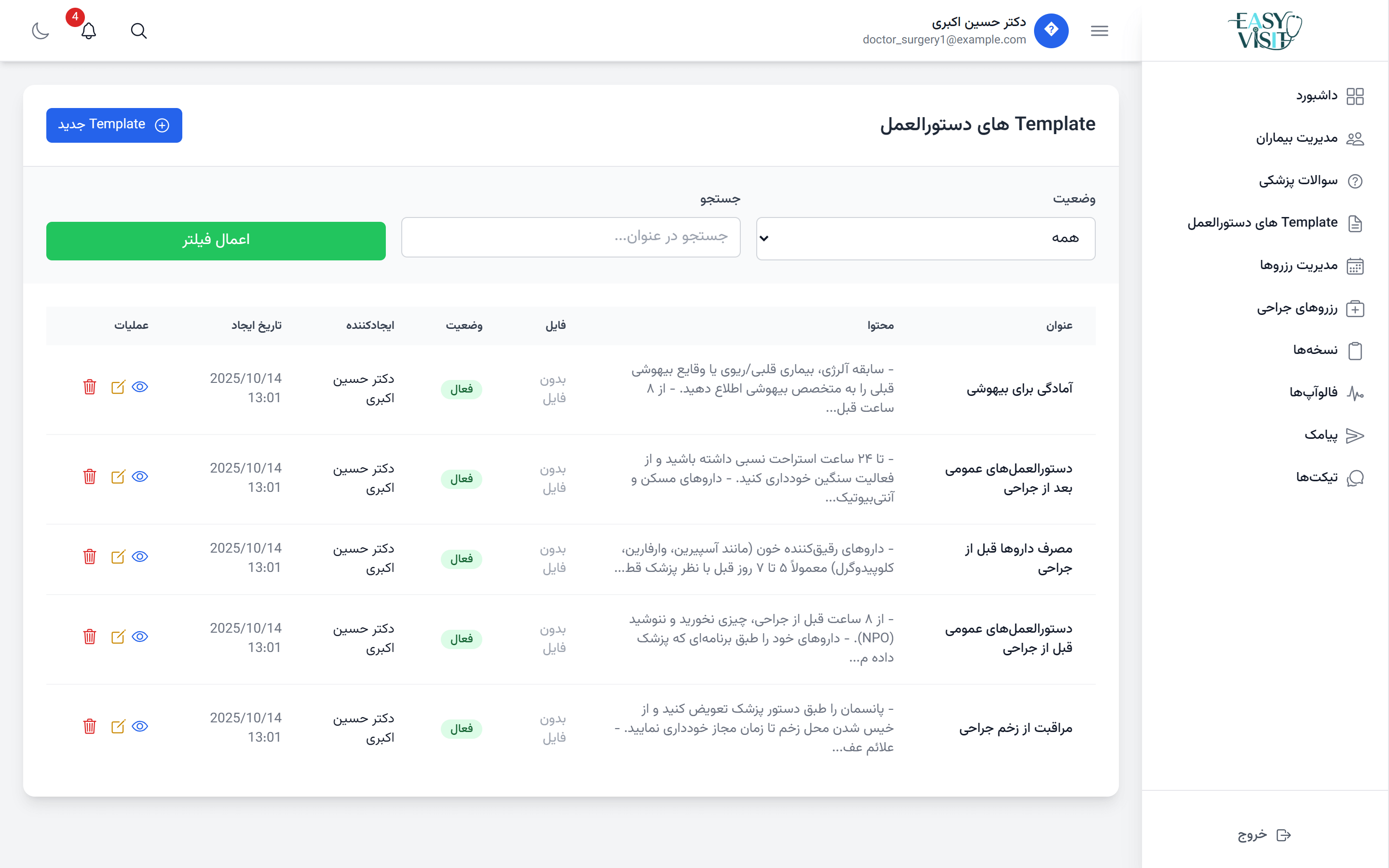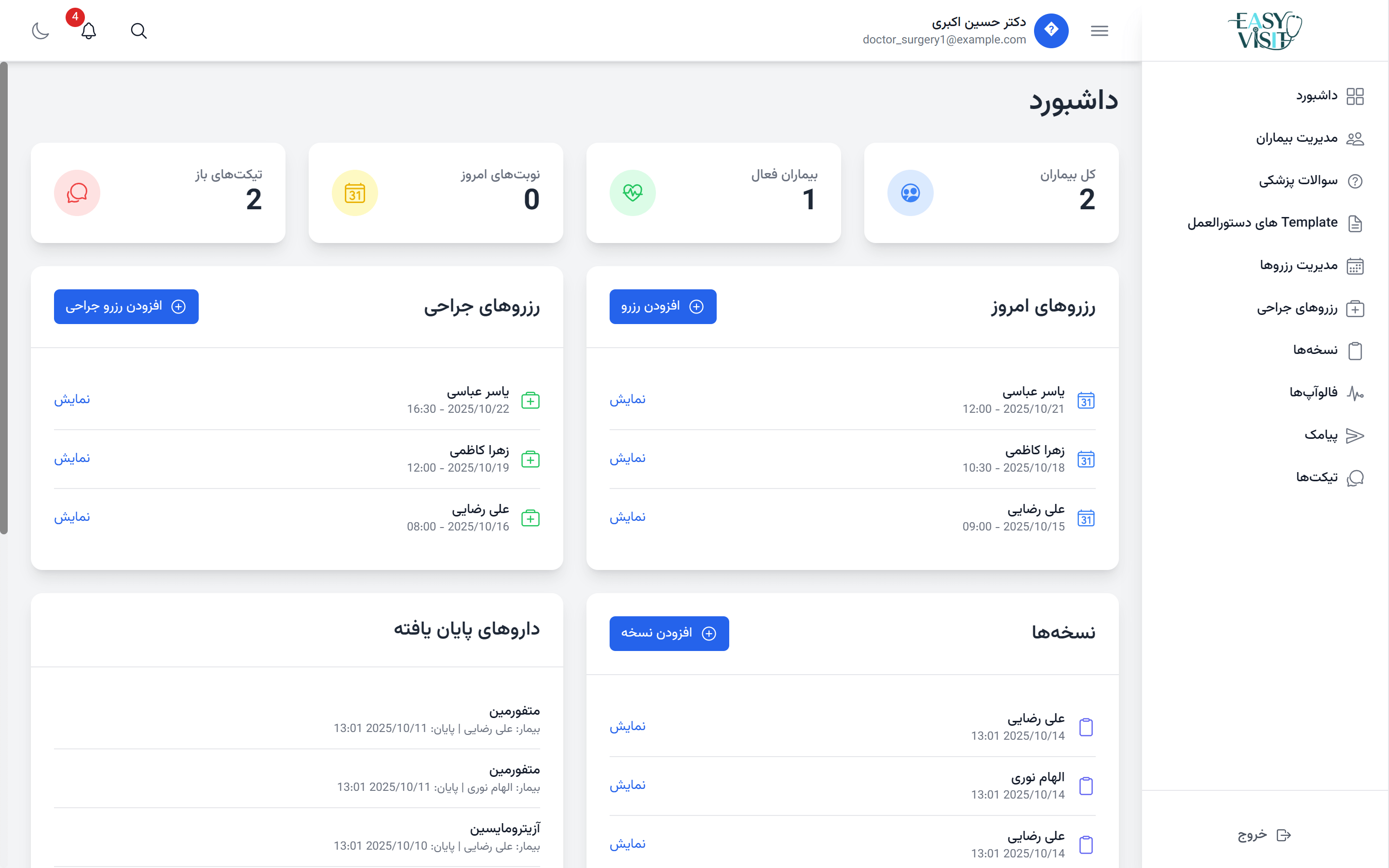 Easy Visit برای تمام تخصصها طراحی شده است؛ از پزشکان عمومی و متخصص تا جراحان. همچنین امکان سفارشیسازی فرمها برای هر تخصص (مثل جراحی مغز، قلب یا ارتوپدی) وجود دارد.